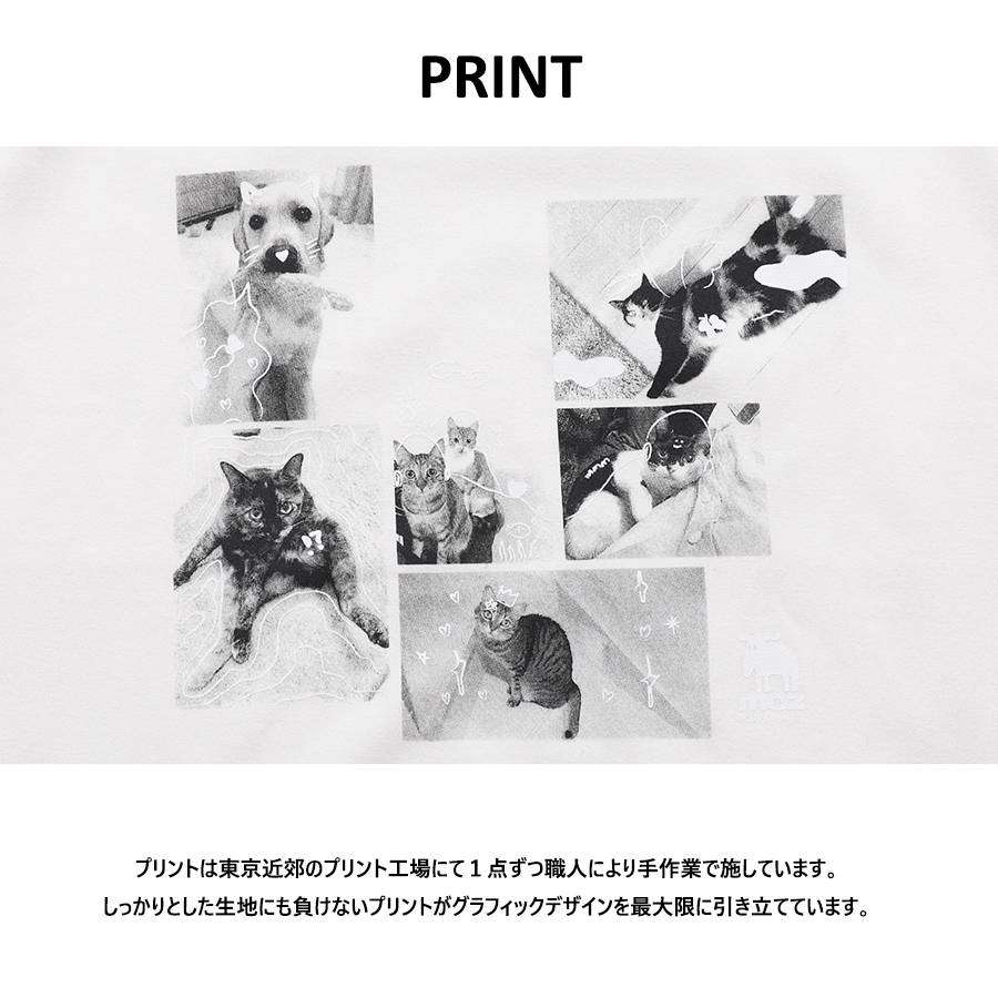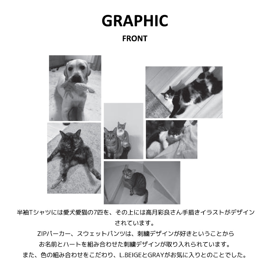 | 商品Data | 高月彩良さんを迎えたmoz FOREST LABEL コラボレーション企画! 今回は半袖Tシャツ、ZIPパーカー、スウェットパンツをご用意! 【デザイン】 半袖Tシャツには愛犬愛猫の7匹を、その上には高月彩良さん手描きイラストがデザインされています。 ZIPパーカー、スウェットパンツは、刺繍デザインが好きということから お名前とハートを組み合わせた刺繍デザインが取り入れられています。 また、色の組み合わせをこだわり、L.BEIGEとGRAYがお気に入りとのことでした。 ここでしか手に入らない受注期間限定アイテムです!是非お買い求めください!!! ※現時点での商品の発送予定時期は【11月中旬頃~11月下旬頃順次発送】 を予定しております 尚、工場の生産の都合上、お客様のご入金・決済のタイミングにより前後する場合がございます。 予めご了承ください。 ※商品代金が10万円以上にて代引き決済を利用してのご注文につきましては、 トラブル防止のため、決済方法をクレジットカード決済もしくはコンビニ決済に変更 させていただく場合がございます。変更前にお電話、メールにてご連絡をさせていただきます。 ※商品によっては撮影時にサンプルを使用しているため若干仕様が異なる場合がございます。 また、サイズ・カラーによっては仕様が異なる場合もございます。 ※手作業で縫製をしているため縫製の仕様により、 個体差が生じてしまいますので、1~2cm程度の誤差は予めご了承くださいませ。 ※洗濯機を使用した場合、お届け時のサイズより多少縮む場合がございます。 洗濯機を使用する場合は裏返してネットに入れることを推奨しております。 また、タンブラー乾燥機を使用しますとプリントが剥がれる恐れがありますので 避けていただきますようお願いいたします。 また、洗濯時の液温は40度以下とし、 塩素系および酸素系漂白剤の使用は避けていただきますようお願いいたします。 アイロンにつきましてもプリント及び刺繍部分は避け、 生地部分にアイロンをかける場合にはあて布をして110度(低温)にてお願いいたします。 ※また、受注生産とさせていただいておりますが、 各色・サイズ毎に生産数に限りがございます為、 生産数の上限に達しました場合在庫切れとなる場合がございます。 予めご了承頂けますようお願い致します。 |
