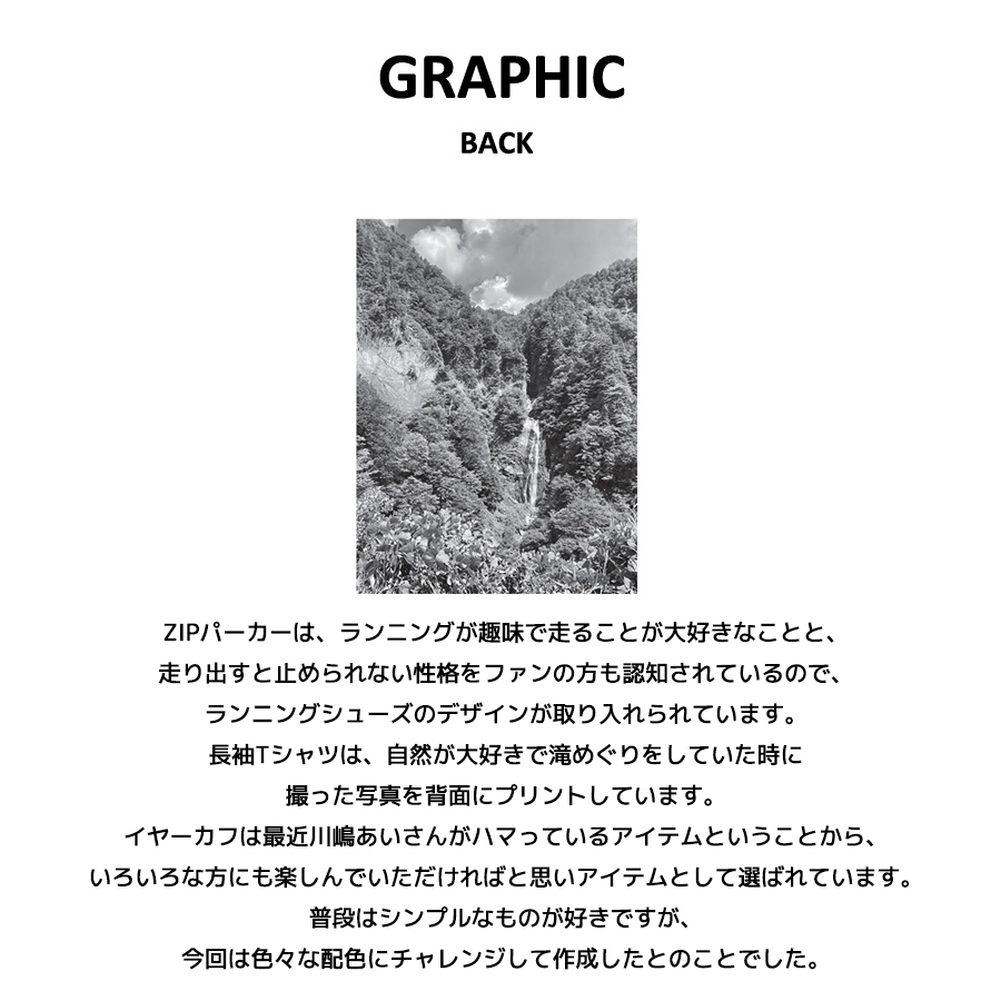 | 商品Data | 川嶋あいさんを迎えたmoz FOREST LABEL コラボレーション企画! 今回は長袖Tシャツ、ZIPパーカー、イヤーカフをご用意! 【デザイン】 ZIPパーカーは、ランニングが趣味で走ることが大好きなことと、走り出すと止められない性格をファンの方も認知されているので、ランニングシューズのデザインが取り入れられています。 長袖Tシャツは、自然が大好きで滝めぐりをしていた時に撮った写真を背面にプリントしています。 イヤーカフは最近川嶋あいさんがハマっているアイテムということから、いろいろな方にも楽しんでいただければと思いアイテムとして選ばれています。 普段はシンプルなものが好きですが、今回は色々な配色にチャレンジして作成したとのことでした。 ※現時点での商品の発送予定時期は【3月下旬頃〜4月上旬頃順次発送】 予定しております。 尚、工場の生産の都合上、お客様のご入金・決済のタイミングにより前後する場合がございます。 予めご了承ください。 ※商品代金が10万円以上にて代引き決済を利用してのご注文につきましては、 トラブル防止のため、決済方法をクレジットカード決済もしくはコンビニ決済に変更 させていただく場合がございます。変更前にお電話、メールにてご連絡をさせていただきます。 ※ ※商品によっては撮影時にサンプルを使用しているため若干仕様が異なる場合がございます。 また、サイズ・カラーによっては仕様が異なる場合もございます。 ※手作業で縫製をしているため縫製の仕様により、 個体差が生じてしまいますので、1~2cm程度の誤差は予めご了承くださいませ。 ※洗濯機を使用した場合、お届け時のサイズより多少縮む場合がございます。 洗濯機を使用する場合は裏返してネットに入れることを推奨しております。 また、タンブラー乾燥機を使用しますとプリントが剥がれる恐れがありますので 避けていただきますようお願いいたします。 また、洗濯時の液温は40度以下とし、 塩素系および酸素系漂白剤の使用は避けていただきますようお願いいたします。 アイロンにつきましてもプリント及び刺繍部分は避け、 生地部分にアイロンをかける場合にはあて布をして110度(低温)にてお願いいたします。 ※また、受注生産とさせていただいておりますが、 各色・サイズ毎に生産数に限りがございます為、 生産数の上限に達しました場合在庫切れとなる場合がございます。 予めご了承頂けますようお願い致します。 |