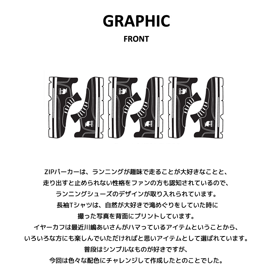 | 商品Data | 川嶋あいさんを迎えたmoz FOREST LABEL コラボレーション企画! 今回は長袖Tシャツ、ZIPパーカー、イヤーカフをご用意! 【デザイン】 ZIPパーカーは、ランニングが趣味で走ることが大好きなことと、走り出すと止められない性格をファンの方も認知されているので、ランニングシューズのデザインが取り入れられています。 長袖Tシャツは、自然が大好きで滝めぐりをしていた時に撮った写真を背面にプリントしています。 イヤーカフは最近川嶋あいさんがハマっているアイテムということから、いろいろな方にも楽しんでいただければと思いアイテムとして選ばれています。 普段はシンプルなものが好きですが、今回は色々な配色にチャレンジして作成したとのことでした。 ※現時点での商品の発送予定時期は【3月下旬頃〜4月上旬頃順次発送】 を予定しております。 尚、工場の生産の都合上、お客様のご入金・決済のタイミングにより前後する場合がございます。 予めご了承ください。 ※商品代金が10万円以上にて代引き決済を利用してのご注文につきましては、 トラブル防止のため、決済方法をクレジットカード決済もしくはコンビニ決済に変更 させていただく場合がございます。変更前にお電話、メールにてご連絡をさせていただきます。※ ※商品によっては撮影時にサンプルを使用しているため若干仕様が異なる場合がございます。 また、サイズ・カラーによっては仕様が異なる場合もございます。 ※手作業で縫製をしているため縫製の仕様により、 個体差が生じてしまいますので、1~2cm程度の誤差は予めご了承くださいませ。 ※洗濯機を使用した場合、お届け時のサイズより多少縮む場合がございます。 洗濯機を使用する場合は裏返してネットに入れることを推奨しております。 また、タンブラー乾燥機の使用は避けていただきますようお願いいたします。 また、洗濯時の液温は40度以下とし、 塩素系および酸素系漂白剤の使用は避けていただきますようお願いいたします。 アイロンにつきましてもプリント及び刺繍部分は避け、 生地部分にアイロンをかける場合にはあて布をして110度(低温)にてお願いいたします。 ※また、受注生産とさせていただいておりますが、 各色・サイズ毎に生産数に限りがございます為、 生産数の上限に達しました場合在庫切れとなる場合がございます。 予めご了承頂けますようお願い致します。 |