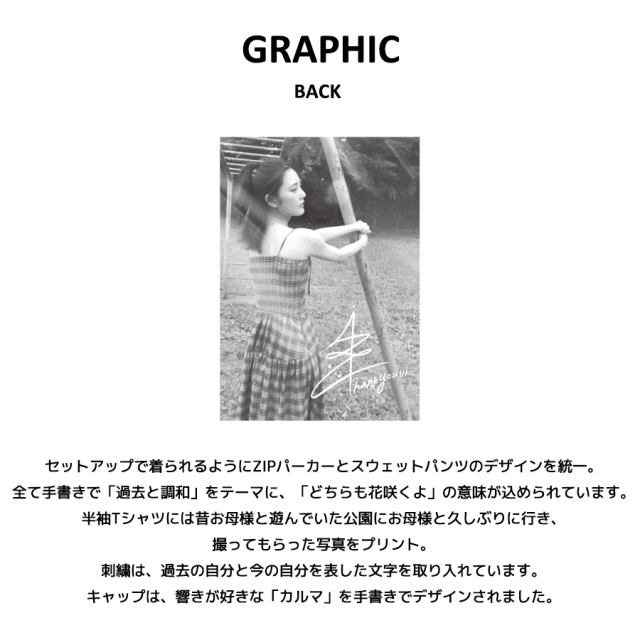 | 商品Data | 北香那さんを迎えたmoz FOREST LABEL コラボレーション企画! 今回は半袖Tシャツ、ZIPパーカー、スウェットパンツ、キャップをご用意! 【デザイン】 セットアップで着られるようにZIPパーカーとスウェットパンツのデザインを統一。 全て手書きで「過去と調和」をテーマに、「どちらも花咲くよ」の意味が込められています。 半袖Tシャツには昔お母様と遊んでいた公園にお母様と久しぶりに行き、撮ってもらった写真をプリント。 刺繍は、過去の自分と今の自分を表した文字を取り入れています。 キャップは、響きが好きな「カルマ」を手書きでデザインされました。 ※現時点での商品の発送予定時期は【3月中旬頃~3月下旬頃順次発送】 を予定しております。 尚、工場の生産の都合上、お客様のご入金・決済のタイミングにより前後する場合がございます。 予めご了承ください。 ※商品代金が10万円以上にて代引き決済を利用してのご注文につきましては、 トラブル防止のため、決済方法をクレジットカード決済もしくはコンビニ決済に変更 させていただく場合がございます。変更前にお電話、メールにてご連絡をさせていただきます。※ ※商品によっては撮影時にサンプルを使用しているため若干仕様が異なる場合がございます。 また、サイズ・カラーによっては仕様が異なる場合もございます。 ※手作業で縫製をしているため縫製の仕様により、 個体差が生じてしまいますので、1~2cm程度の誤差は予めご了承くださいませ。 ※洗濯機を使用した場合、お届け時のサイズより多少縮む場合がございます。 洗濯機を使用する場合は裏返してネットに入れることを推奨しております。 また、タンブラー乾燥機を使用しますとプリントが剥がれる恐れがありますので 避けていただきますようお願いいたします。 また、洗濯時の液温は40度以下とし、 塩素系および酸素系漂白剤の使用は避けていただきますようお願いいたします。 アイロンにつきましてもプリント及び刺繍部分は避け、 生地部分にアイロンをかける場合にはあて布をして110度(低温)にてお願いいたします。 ※また、受注生産とさせていただいておりますが、 各色・サイズ毎に生産数に限りがございます為、 生産数の上限に達しました場合在庫切れとなる場合がございます。 予めご了承頂けますようお願い致します。 |