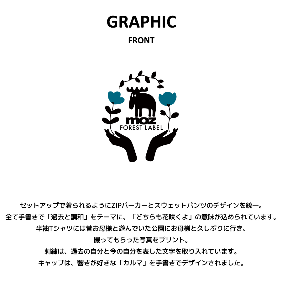 | 商品Data | 北香那さんを迎えたmoz FOREST LABEL コラボレーション企画! 今回は半袖Tシャツ、ZIPパーカー、スウェットパンツ、キャップをご用意! 【デザイン】 セットアップで着られるようにZIPパーカーとスウェットパンツのデザインを統一。 全て手書きで「過去と調和」をテーマに、「どちらも花咲くよ」の意味が込められています。 半袖Tシャツには昔お母様と遊んでいた公園にお母様と久しぶりに行き、撮ってもらった写真をプリント。 刺繍は、過去の自分と今の自分を表した文字を取り入れています。 キャップは、響きが好きな「カルマ」を手書きでデザインされました。 ※現時点での商品の発送予定時期は【3月中旬頃~3月下旬頃順次発送】 を予定しております。 尚、工場の生産の都合上、お客様のご入金・決済のタイミングにより前後する場合がございます。 予めご了承ください。 ※商品代金が10万円以上にて代引き決済を利用してのご注文につきましては、 トラブル防止のため、決済方法をクレジットカード決済もしくはコンビニ決済に変更 させていただく場合がございます。変更前にお電話、メールにてご連絡をさせていただきます。 ※商品によっては撮影時にサンプルを使用しているため若干仕様が異なる場合がございます。 また、サイズ・カラーによっては仕様が異なる場合もございます。 ※手作業で縫製をしているため縫製の仕様により、 個体差が生じてしまいますので、1~2cm程度の誤差は予めご了承くださいませ。 ※洗濯機を使用した場合、お届け時のサイズより多少縮む場合がございます。 洗濯機を使用する場合は裏返してネットに入れることを推奨しております。 また、タンブラー乾燥機を使用しますとプリントが剥がれる恐れがありますので 避けていただきますようお願いいたします。 また、洗濯時の液温は40度以下とし、 塩素系および酸素系漂白剤の使用は避けていただきますようお願いいたします。 アイロンにつきましてもプリント及び刺繍部分は避け、 生地部分にアイロンをかける場合にはあて布をして110度(低温)にてお願いいたします。 ※また、受注生産とさせていただいておりますが、 各色・サイズ毎に生産数に限りがございます為、 生産数の上限に達しました場合在庫切れとなる場合がございます。 予めご了承頂けますようお願い致します。 |