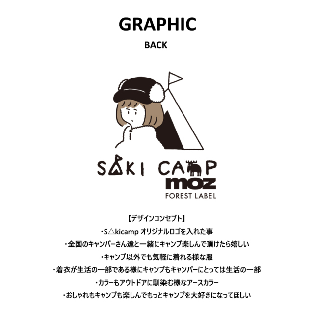 | 商品Data | Saki campさんを迎えたmoz FOREST LABEL コラボレーション企画! 今回は半袖Tシャツ、プルオーバーパーカー、キャップをご用意! 【デザインコンセプト】 ・S△kicamp オリジナルロゴを入れた事 ・全国のキャンパーさん達と一緒にキャンプ楽しんで頂けたら嬉しい ・キャンプ以外でも気軽に着れる様な服 ・着衣が生活の一部である様にキャンプもキャンパーにとっては生活の一部 ・カラーもアウトドアに馴染む様なアースカラー ・おしゃれもキャンプも楽しんでもっとキャンプを大好きになってほしい ※現時点での商品の発送予定時期は【5月上旬頃~5月中旬頃順次発送予定】を予定しております。 尚、工場の生産の都合上、お客様のご入金・決済のタイミングにより前後する場合がございます。 予めご了承ください。 ※商品代金が10万円以上にて代引き決済を利用してのご注文につきましては、 トラブル防止のため、決済方法をクレジットカード決済もしくはコンビニ決済に変更 させていただく場合がございます。変更前にお電話、メールにてご連絡をさせていただきます。※ ※商品によっては撮影時にサンプルを使用しているため若干仕様が異なる場合がございます。 また、サイズ・カラーによっては仕様が異なる場合もございます。 ※手作業で縫製をしているため縫製の仕様により、 個体差が生じてしまいますので、1~2cm程度の誤差は予めご了承くださいませ。 ※洗濯機を使用した場合、お届け時のサイズより多少縮む場合がございます。 洗濯機を使用する場合は裏返してネットに入れることを推奨しております。 また、タンブラー乾燥機を使用しますとプリントが剥がれる恐れがありますので 避けていただきますようお願いいたします。 また、洗濯時の液温は40度以下とし、 塩素系および酸素系漂白剤の使用は避けていただきますようお願いいたします。 アイロンにつきましてもプリント及び刺繍部分は避け、 生地部分にアイロンをかける場合にはあて布をして110度(低温)にてお願いいたします。 ※また、受注生産とさせていただいておりますが、 各色・サイズ毎に生産数に限りがございます為、 生産数の上限に達しました場合在庫切れとなる場合がございます。 予めご了承頂けますようお願い致します。 |