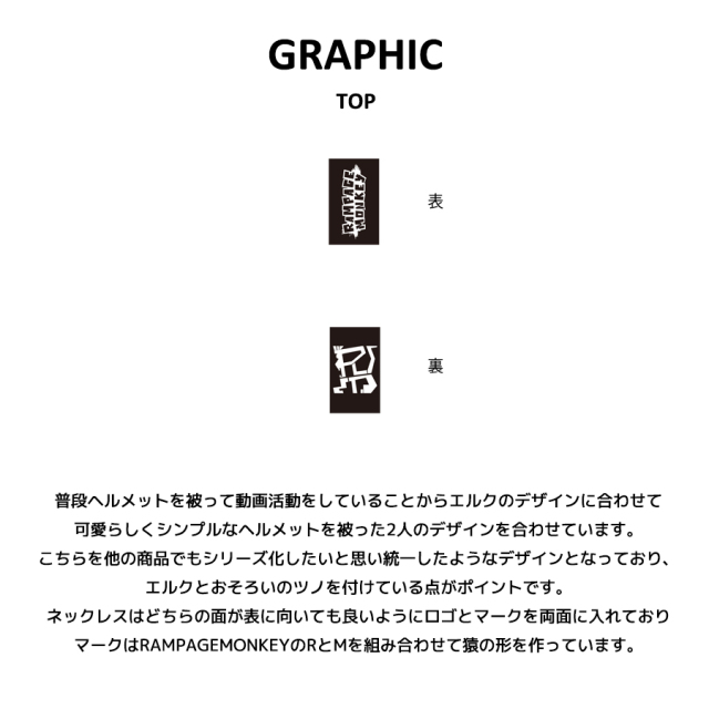 | 商品Data | RAMPAGE MONKEYさんを迎えたmoz FOREST LABEL コラボレーション企画! 今回は半袖Tシャツ、長袖Tシャツ、ネックレスをご用意! 【デザインコンセプト】 普段ヘルメットを被って動画活動をしていることから エルクのデザインに合わせて可愛らしくシンプルなヘルメットを 被った2人のデザインを合わせています。 こちらを他の商品でもシリーズ化したいと思い統一したような デザインとなっており、エルクとおそろいのツノを付けている点がポイントです。 ネックレスはどちらの面が表に向いても良いようにロゴとマークを両面に入れており マークはRAMPAGEMONKEYのRとMを組み合わせて猿の形を作っています。 メッキ加工:国内加工 原型作成:国内 ※現時点での商品の発送予定時期は【7月中旬頃~7月下旬頃順次発送】を予定しております。 尚、工場の生産の都合上、お客様のご入金・決済のタイミングにより前後する場合がございます。 予めご了承ください。 ※アレルギーの反応等がその時の体調や個人差により出る場合がございますので、 金属製アクセサリーを初めてご使用の場合は必ず「パッチテスト」をしてご使用ください。※ 【パッチテストとは】 金属アレルギーの場合、特殊なテープに24種類の金属試薬をつけてアレルギーの有無を調べる検査です。 皮膚科などで相談をすれば身近にできる検査です。 いくつか検査中に注意する点がありますのでテストを受ける病院で検査について相談してください。 |